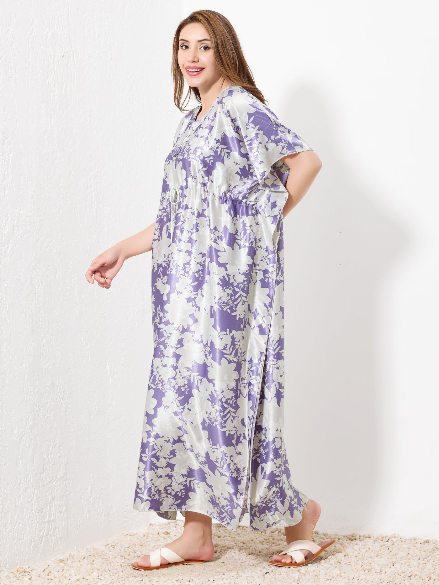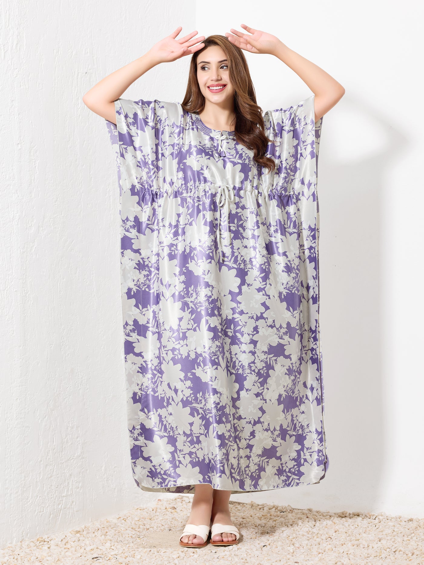 For all seasons and ultimate comfort, Priincezz Nightwear brings you this luxurious purple and white satin kaftan. Designed for effortless elegance, it features a soft V-neckline with delicate detailing and a lightweight, silky-smooth satin fabric that drapes beautifully. The adjustable drawstring waist ensures a customized fit, making it perfect for lounging at home or unwinding at a resort.