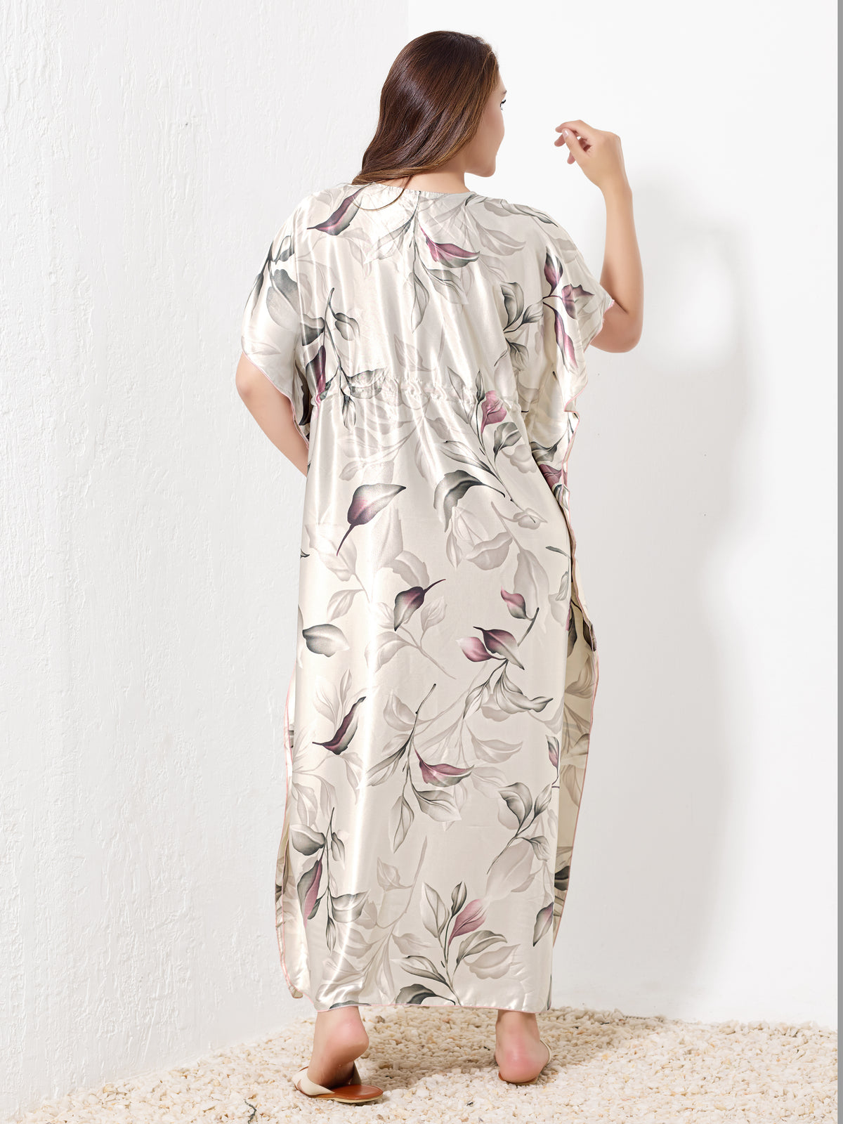 For all seasons and ultimate comfort, Priincezz Nightwear brings you this luxurious silver satin kaftan adorned with pink leaf prints. Designed for effortless elegance, it boasts a soft V-neckline and a lightweight satin fabric that glides against the skin. The adjustable drawstring waist offers a custom fit, making it perfect for relaxing at home or treating yourself on vacation.