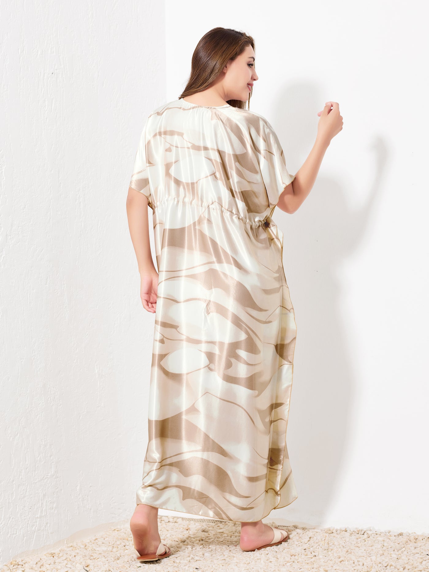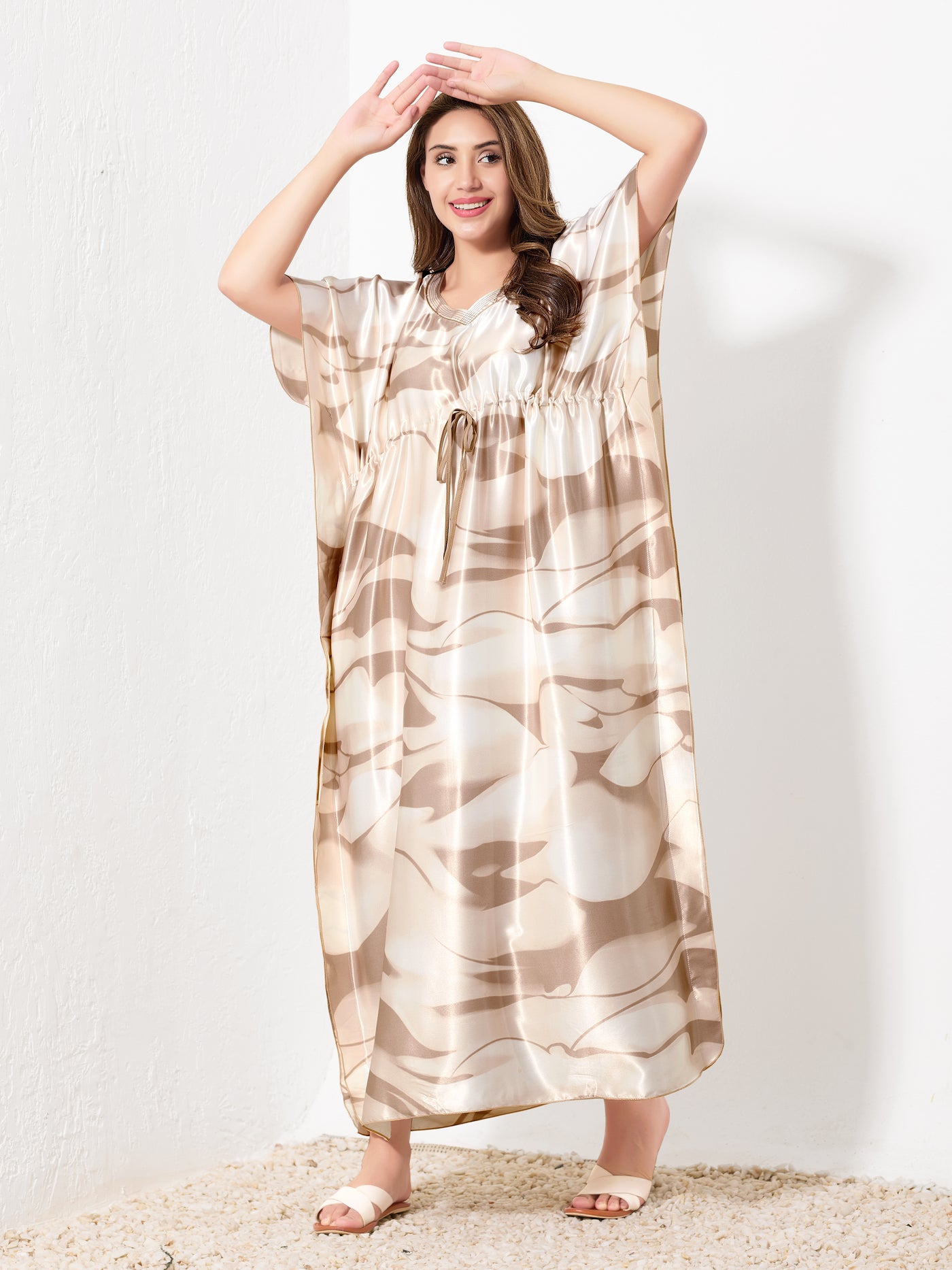 For all seasons and ultimate comfort, Priincezz Nightwear presents this beige satin kaftan featuring a soft abstract pattern. Designed for effortless elegance, it has a soft V-neckline and lightweight satin fabric that drapes beautifully. The adjustable drawstring waist ensures a flattering fit, making it perfect for lounging at home or relaxing on holiday.