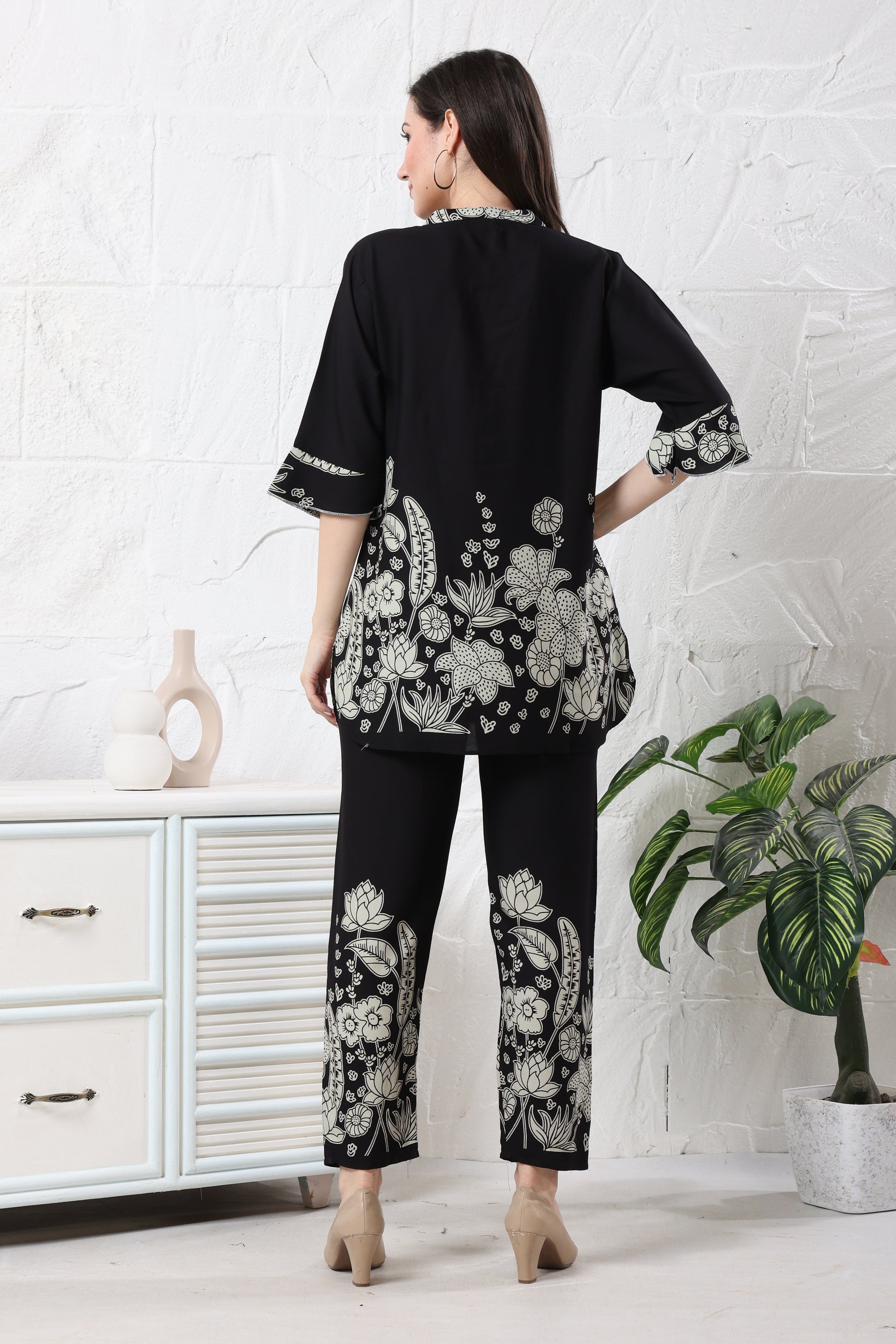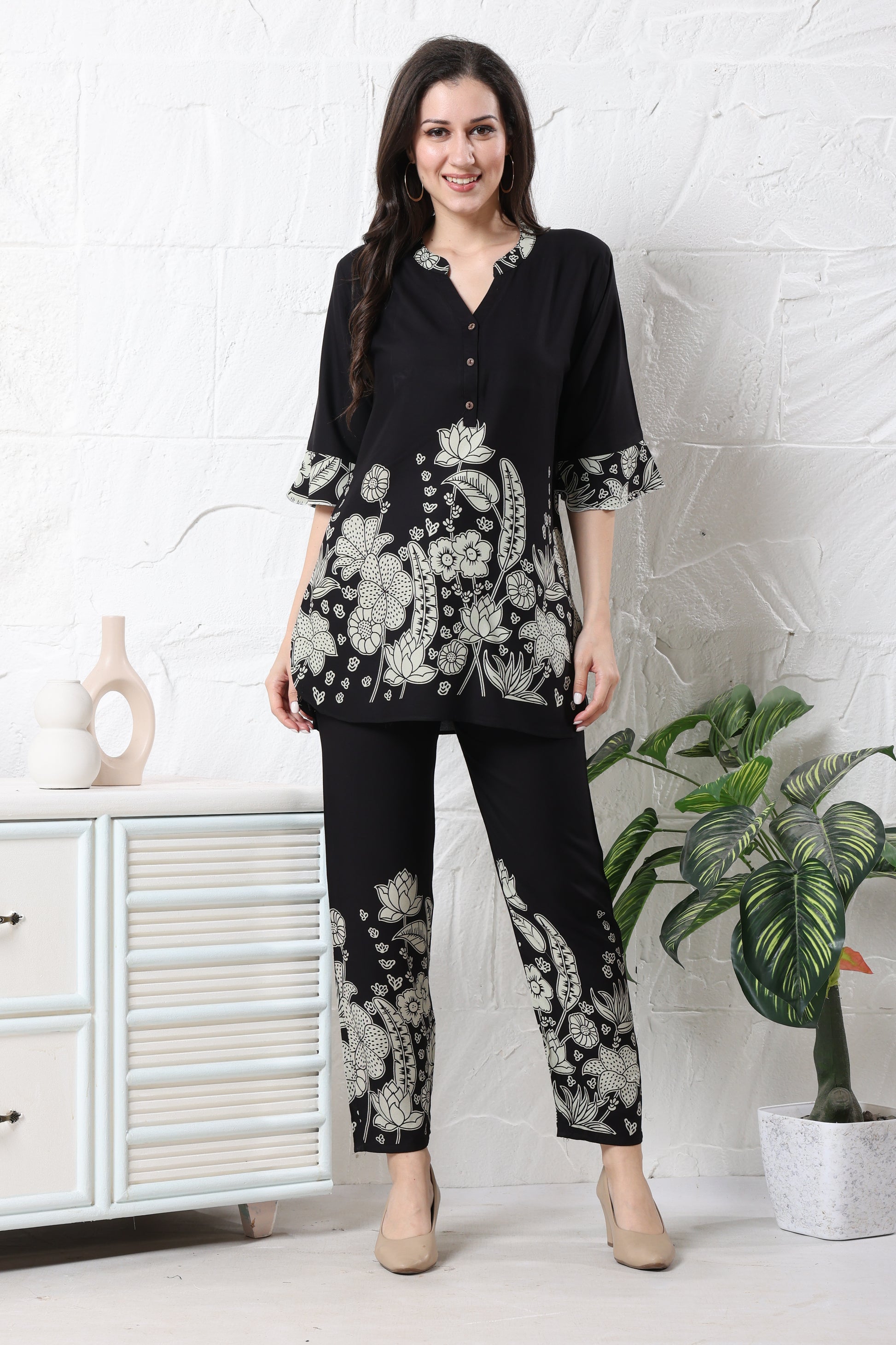 This Black Floral Printed Rayon Co-ord Set combines comfort and style with its breathable, lightweight rayon fabric and elegant floral pattern. Designed for a coordinated look, it offers easy styling and a flattering fit, making it ideal for casual outings or relaxed gatherings. The set ensures all-day comfort without compromising on chic appeal.