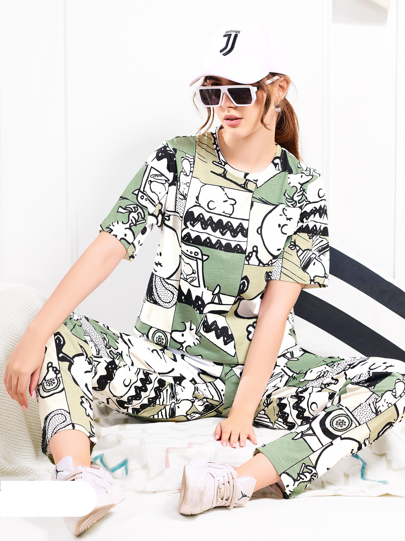 Elevate your nightwear collection with this stylish cartoon print round neck nightsuit. Designed in refreshing green and white tones, it features a soft, breathable fabric with a comfortable top and matching pants. The quirky character design adds a youthful charm, making it perfect for sleep, lounging, or cozy days indoors. Complete the look with soft slippers or a headband for relaxed, effortless comfort.