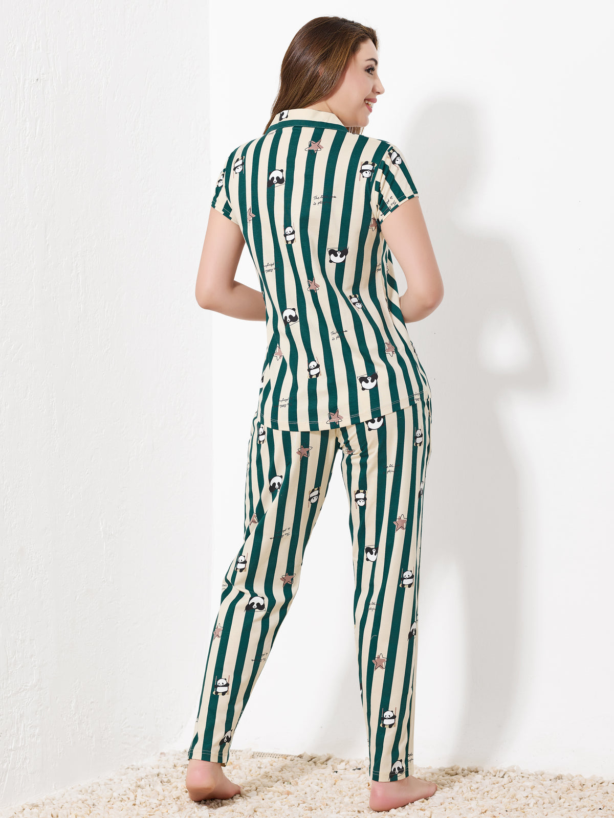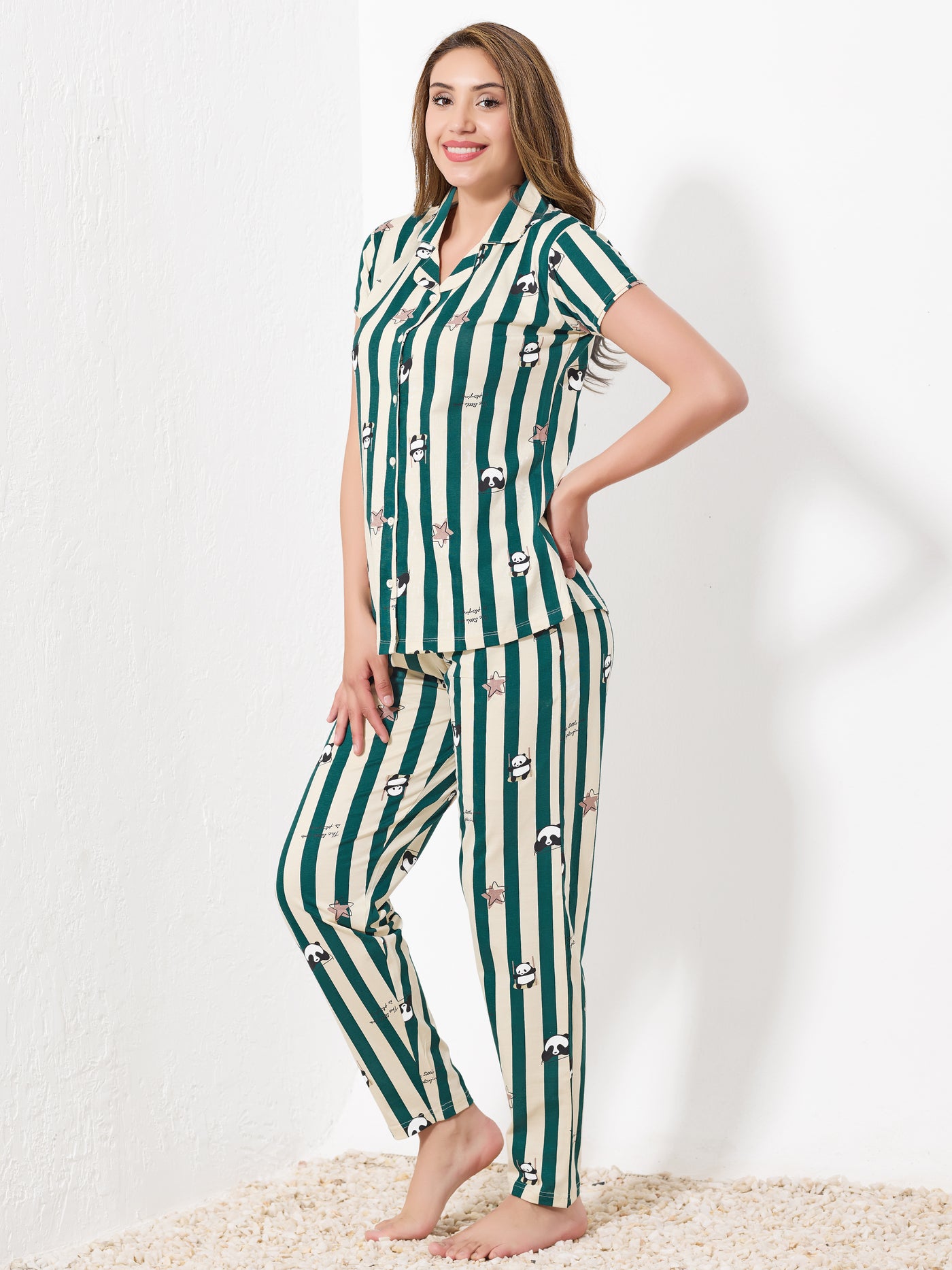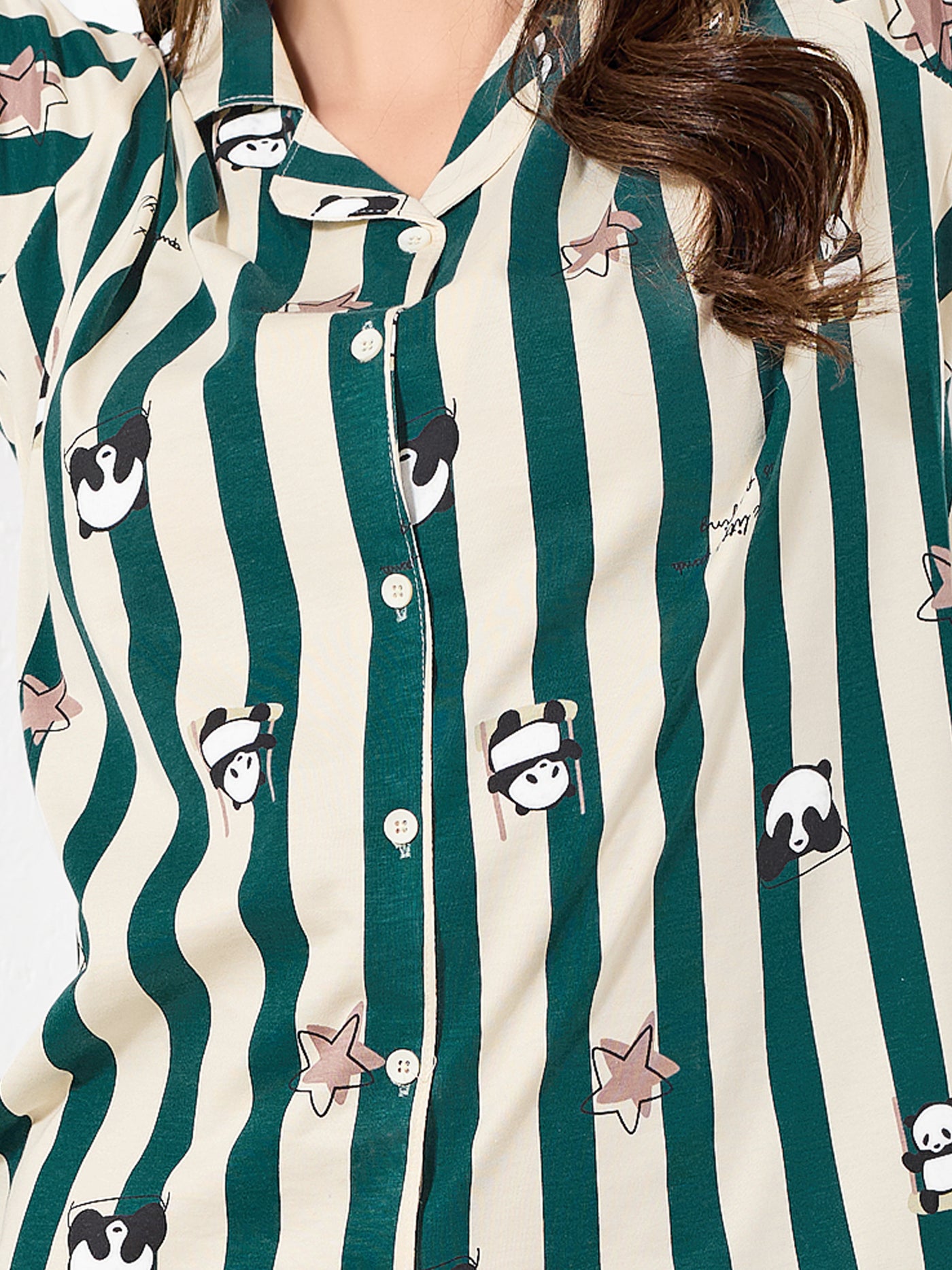 Priincezz Nightwear presents this stylish and cozy nightwear co-ord set, crafted for ultimate comfort and a playful charm. Made from soft, breathable fabric, this set includes a classic button-down shirt with a notched collar and matching relaxed-fit pants, offering a luxurious yet lightweight feel. The white base with dark green straps and cool panda prints adds a trendy and fun touch, making it perfect for lounging at home or unwinding in style.