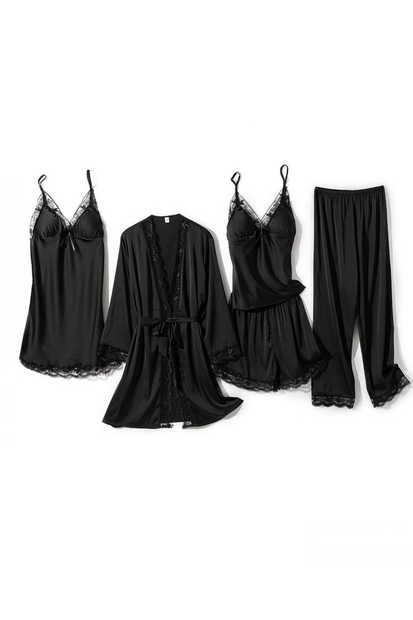 This complete set includes a satin slip, a delicate camisole, matching shorts, full-length pants, and a flowing robe with a tie-up belt—giving you endless mix-and-match styling options for every mood and moment. Subtle lace detailing along the edges adds a refined feminine touch, elevating the overall look while keeping it effortlessly wearable.