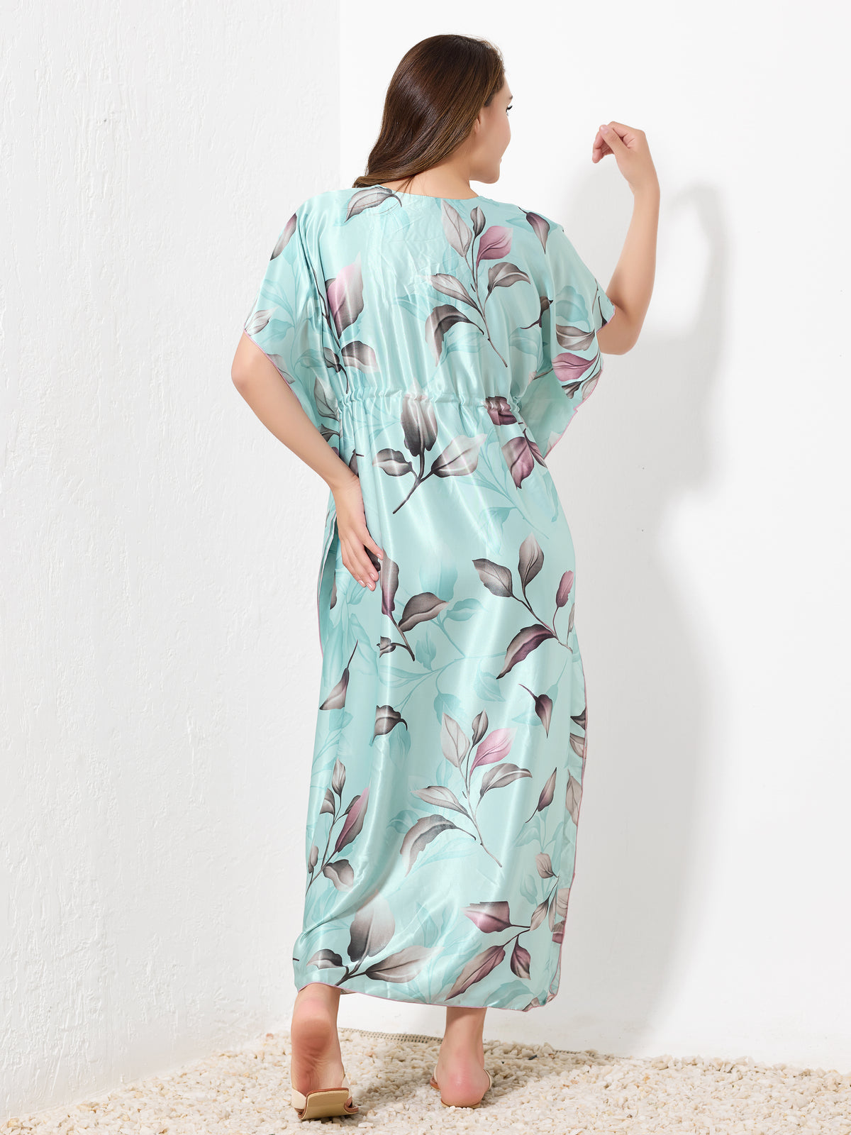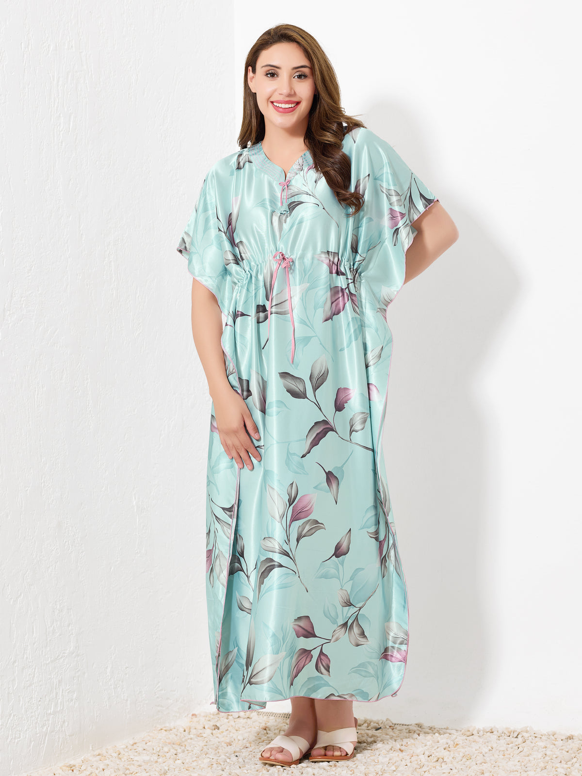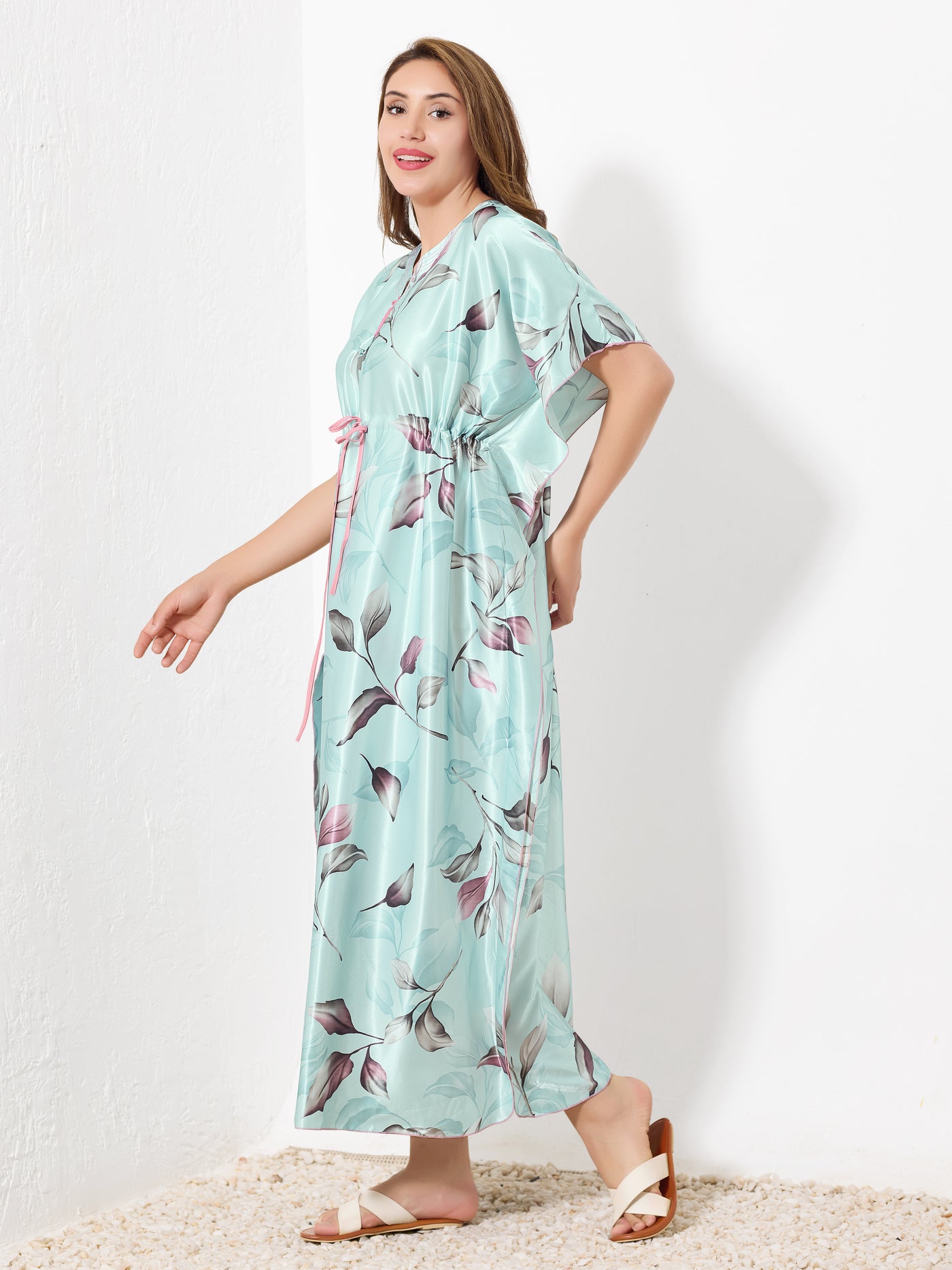 This Priincezz luxurious mint satin kaftan with pink leaf accents is the perfect blend of luxury and comfort. The soft V-neckline adds a touch of feminine grace, while the lightweight satin fabric keeps you cool and relaxed. With an adjustable drawstring waist for easy customization, it’s an ideal option for both lounging and sleeping in style.